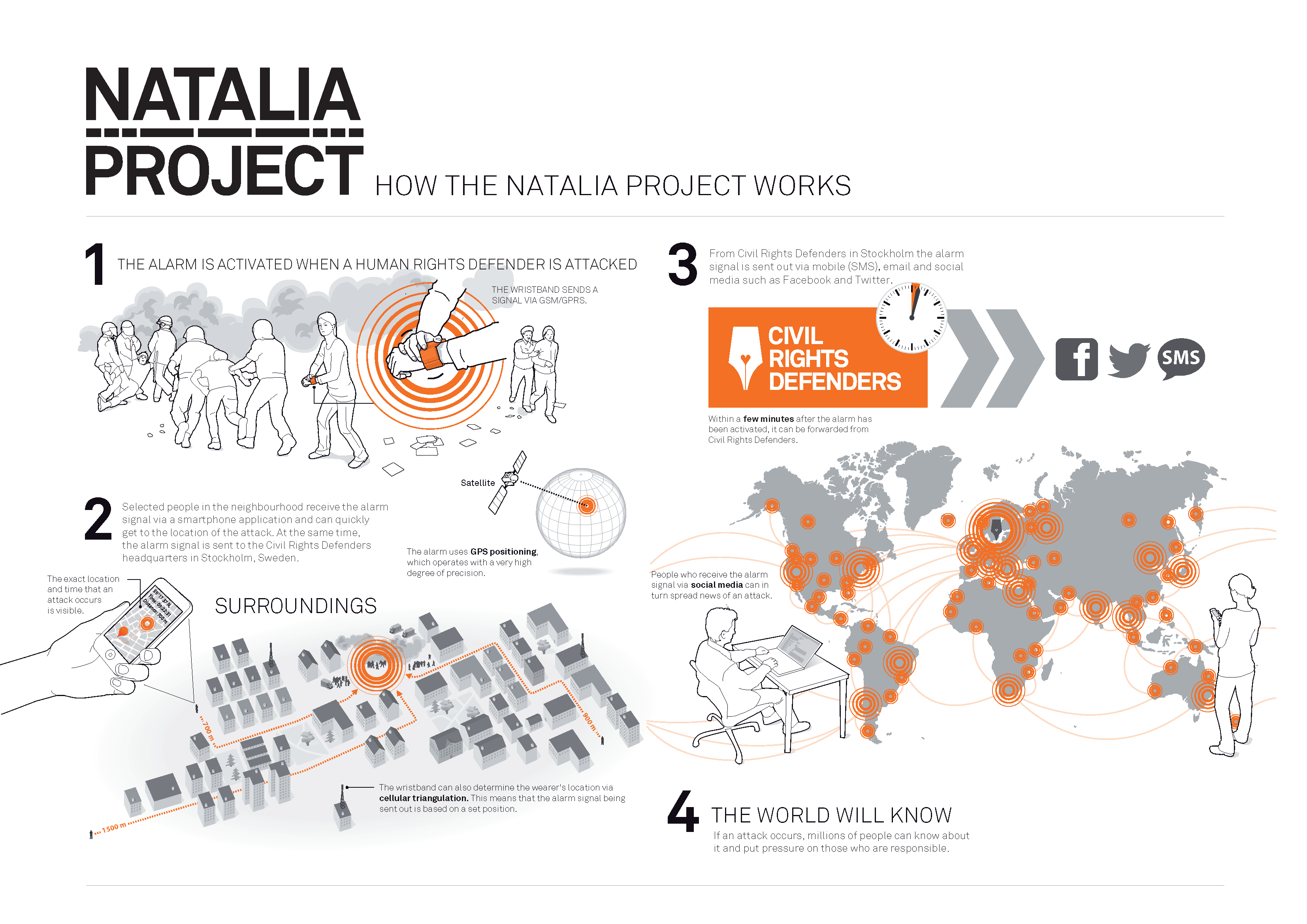 - Utvalda personer i närområdet tar emot en nödsignal, och kan snabbt ta sig till platsen för attacken. Signalen skickas även till Civil Rights Defenders huvudkontor i Stockholm.